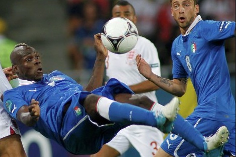 Why, the striker could have hit a simpler, “normal” shot by adjusting his positioning as he saw the ball coming in from Pirlo…  But no, Balotelli does not just want to score…  Balotelli wants the crowd to go wild!!!