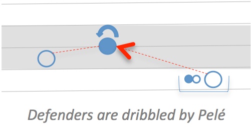 Comparing the two sentences, you will have worked out that the meaning is absolutely identical.  So are the nouns used (“Pelé” and “defenders”).  Now… although the verb used is also the same (“to dribble”), you can see that, in the first picture, there is something different about it: it is in the passive voice.