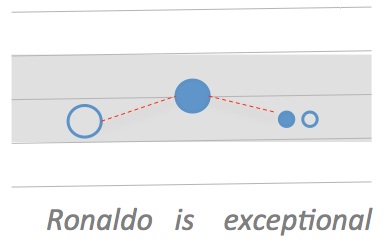 In the example above, “Ronaldo” is the vocative.  In ToB, The vocative is represented by a smubble attached to the right of the ebble representing the noun. Again, this is positioned in the same space of the subject.