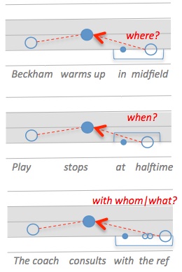 • Extra time (1):  complements of origin, state, destination, transition. Or is it right-back, mid-fielder, forward and left-wing? Football and language are both firmly rooted in space-time.