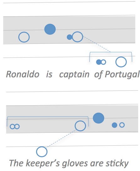 But hang on, what are those  smebbles and  smubbles in the picture?   Those are the symbols for other types of word, the player’s kit described in the 1st half: articles (a), adjectives (beautiful), prepositions (to)*.  Their position is always in line with the noun they refer to.